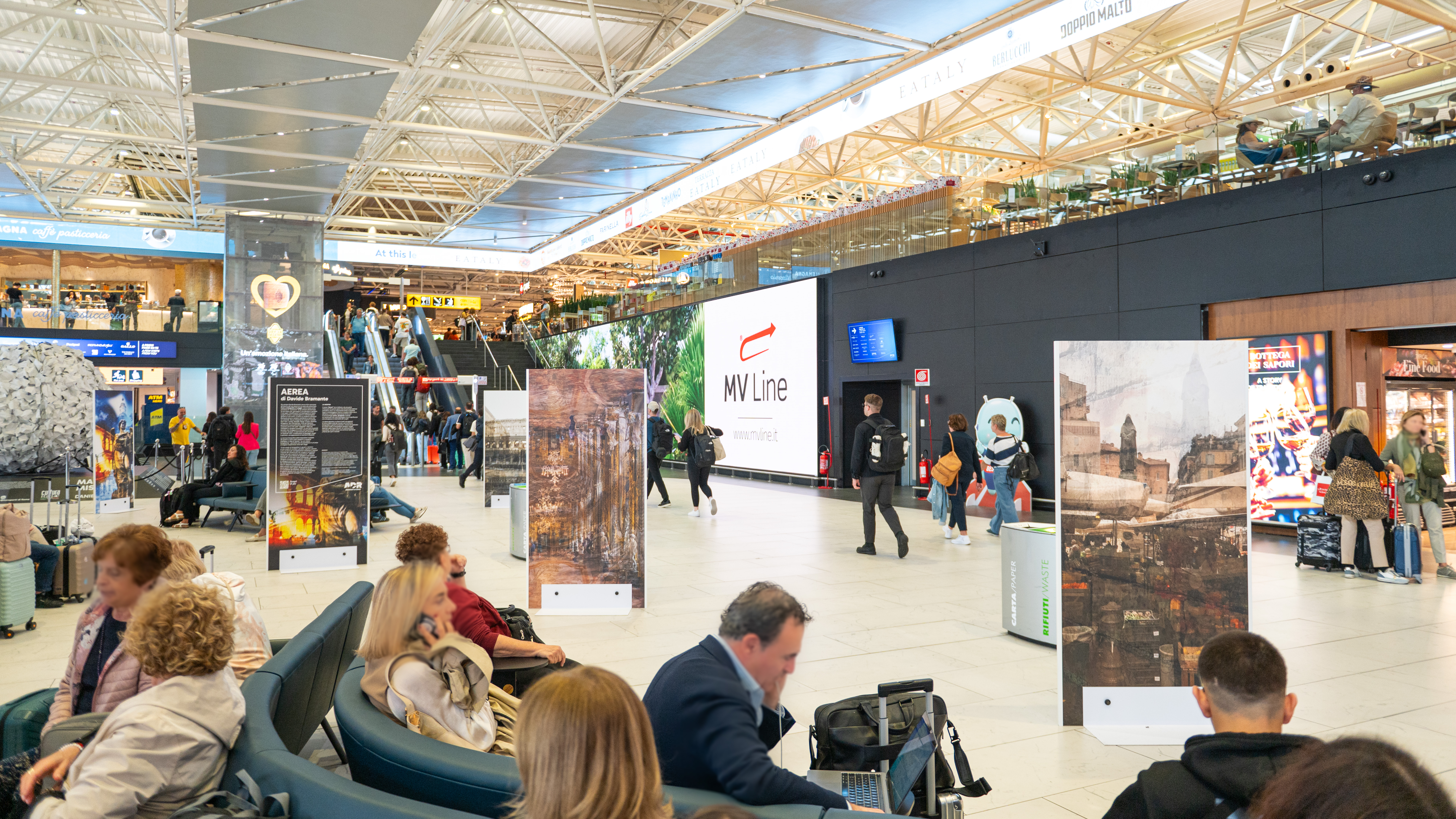 The Aerea series consists of seven photographic installations suspended about three metres from the ceiling, resembling light floating curtains. Designed to move as passengers pass by, they create a direct and poetic interaction with the public, evoking the continuous transit between places and cultures. The title not only recalls the lightness of flight, but also plays on the assonance with aeroporto (airport), suggesting a deep connection between image, space and meaning.