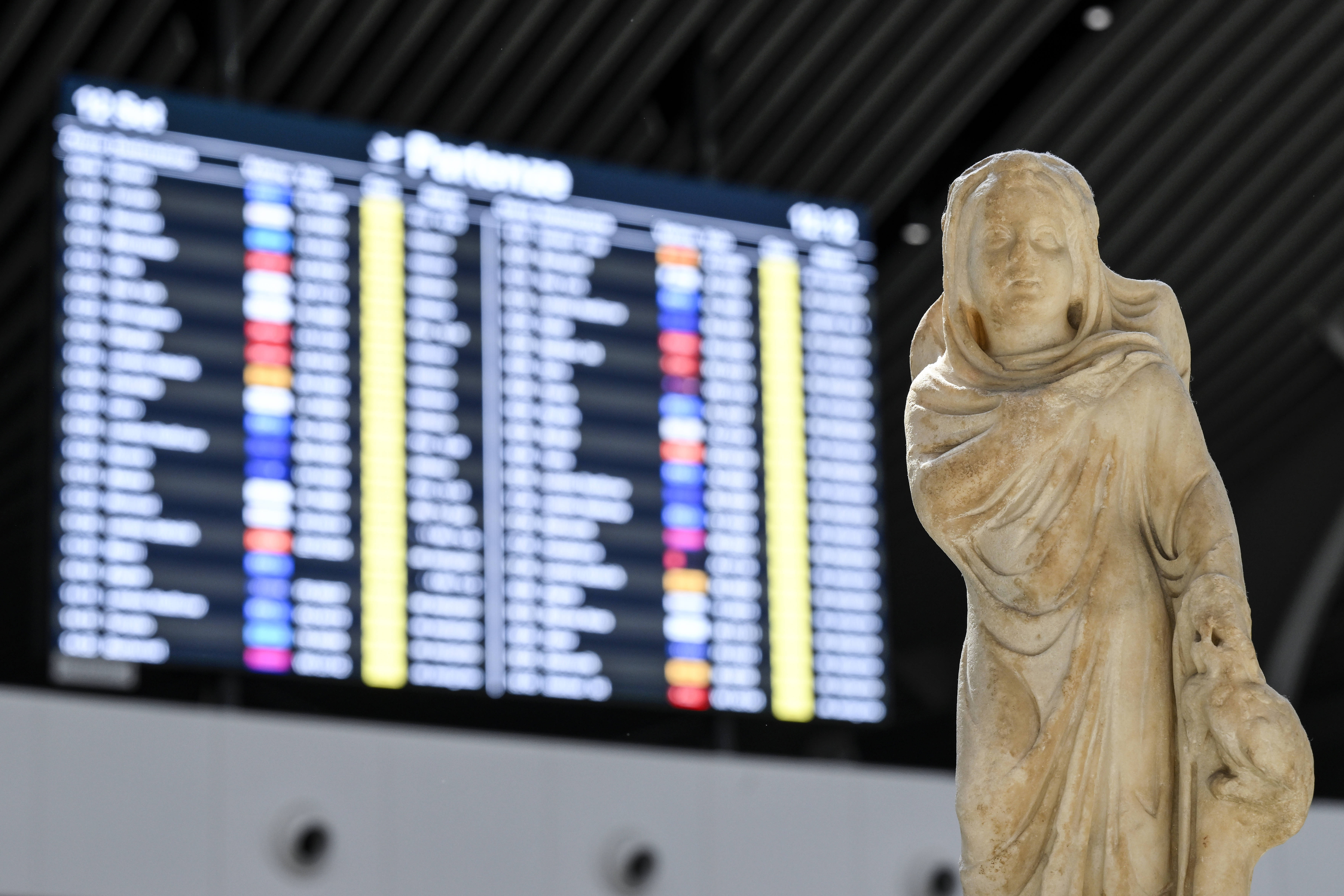 Dal 18 maggio 2022, lungo il corpo di collegamento verso il Molo A del Terminal 1, i passeggeri possono ammirare preziose opere di età romana provenienti dagli scavi di Ostia antica e dalla Necropoli di Isola Sacra. Il percorso espositivo “Uomini e dei a Ostia antica”, su progetto scientifico a cura del Parco archeologico di Ostia antica e con il supporto logistico di AdR, include le statue di Apollo, di Sabina come Cerere, di Ninfa, di una divinità femminile forse Demetra o Cerere, di Faustina Maggiore e di un gruppo scultoreo con fanciullo a dorso di un mulo. Opere rappresentative del panorama artistico e figurativo dell’antica colonia romana, provenendo da contesti monumentali urbani e dal territorio della città (Terme di Nettuno, Teatro, Necropoli di Porto all’Isola Sacra).