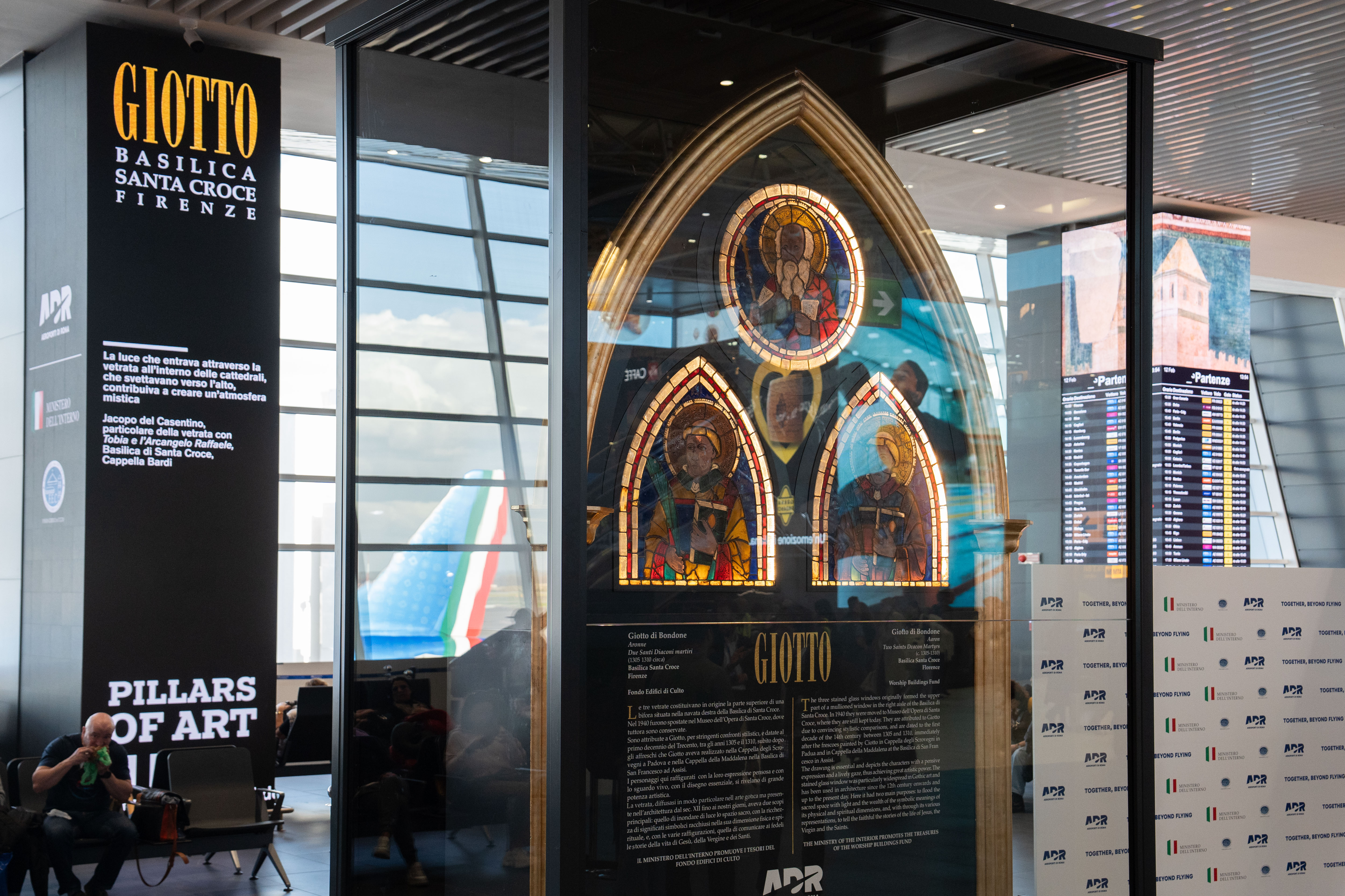 I tre pannelli, di proprietà del FEC – Fondo Edifici di Culto del Ministero dell’Interno, ente che assicura la tutela, la valorizzazione la conservazione e il restauro del nostro prezioso patrimonio artistico, sono stati concessi in prestito ad ADR per essere esposti nella Piazza del Terminal 1 fino a settembre 2024.