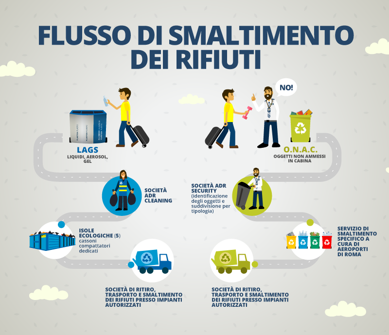 Successivamente, una società del Gruppo ADR, ADR Cleaning, si occuperà della raccolta dei rifiuti destinati alle isole ecologiche dedicate e che in seguito verranno ritirati e smaltiti presso impianti autorizzati.